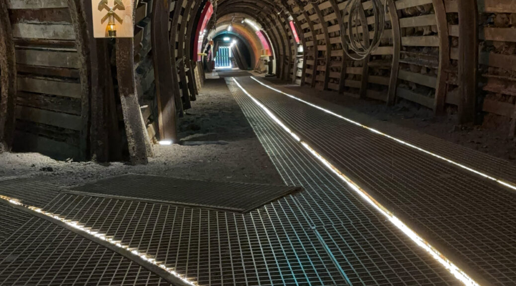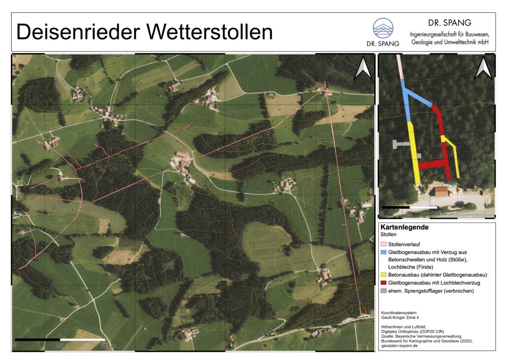 Das kleine Bild zeigt die Begehbarkeit des Deisenrieder Wetterstollens. Am sogenannten Streckenkreuz (blau markierter Bereich) kann bis ca. 500m hineingeschaut werden. Dort ist ein sogenannter Verbruch. Der Stahlausbau an diesem Punkt ist instabil geworden und eingebrochen (bergmännisch: verbrochen). Um zu zeigen, wie weit hinein man gehen könnte, wurde an der Stelle des Verbruches eine fluoreszierende Tafel angebracht, die angestrahlt wird. Dieser Bereich (Streckenkreuz bis zum Verbruch) ist für den Besucher nicht begehbar.